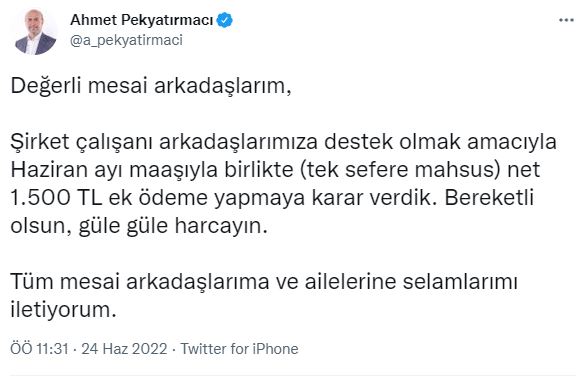 “Değerli mesai arkadaşlarım, şirket çalışanı arkadaşlarımıza destek olmak amacıyla Haziran ayı maaşıyla birlikte (tek sefere mahsus) net 1.500 TL ek ödeme yapmaya karar verdik. Bereketli olsun, güle güle harcayın. Tüm mesai arkadaşlarıma ve ailelerine selamlarımı iletiyorum. Biz hep birlikte büyük bir aileyiz.”