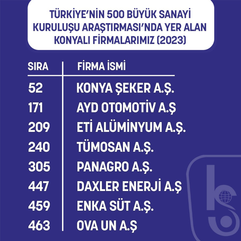 Açıklamasında Konya’nın devler listesindeki gücünü artırdığını kaydeden Başkan Büyükeğen, “Konya’mız 12 organize sanayi bölgesi, 100’den fazla sanayi sitesi ve muhtelif yerlerdeki üretim tesisleri ile ülkemizin sanayi üretimine güçlü katkı vermeye devam ediyor. Konya’mız üretimdeki gücü ile Türkiye’nin önemli sanayi merkezlerinden biri haline gelmiş durumda. Türkiye’nin 500 Büyük Sanayi Kuruluşu arasında yer alan firmalarımız da bunun en büyük göstergesi. Sanayi devlerinin bulunduğu listede geçtiğimiz yıl 7 firmamız yer alıkken, bu yıl firma sayımız 8’e yükseldi. Konya Şeker, AYD Otomotiv, Eti Alüminyum, TÜMOSAN Motor, Panagro Tarım, Daxler Enerji, Enka Süt ve Ova Un firmalarımız İlk 500 Büyük Sanayi Kuruluş arasında yer adı. Listede yer alma başarısı gösteren tüm firmalarımızı ve çalışanlarını yürekten kutluyorum. Firmalarımızın üretim ve ihracattaki başarısı ile birlikte, şehrimiz çok daha güzel başarılara imza atacaktır” diye konuştu.