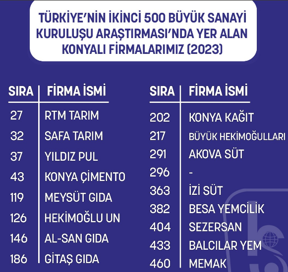 Türkiye’nin İkinci 500 Büyük Sanayi Kuruluşu arasında yer alan Konyalı firmalar: RTM Tarım, Safa Tarım, Yıldız Pul, Konya Çimento, Meysüt Gıda, Hekimoğlu Un, Al-San Gıda, Gitaş Gıda, Konya Kağıt, Büyük Hekimoğulları Gıda, Akova Süt, isminin açıklanmasını istemiyor, İzi Süt, Besa Yemcilik, Sezarsan, Balcılar Yem, Memak.