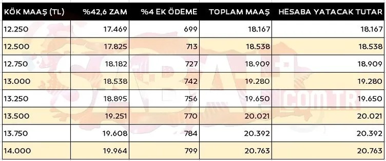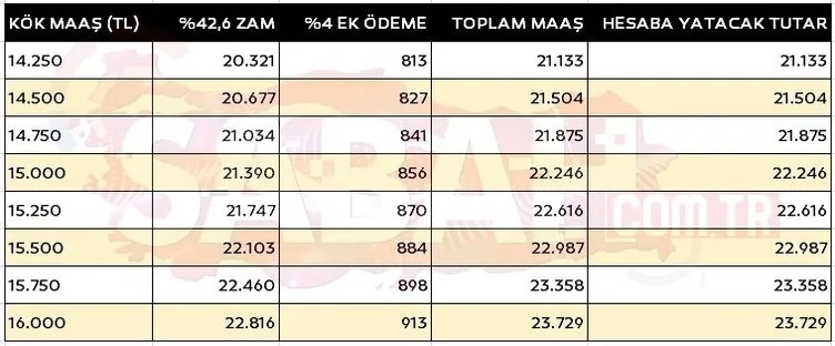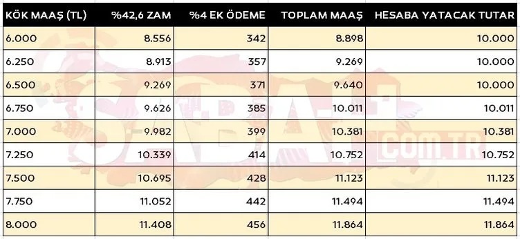 Zamlı emekli maaşları hesaplanırken, önce kök maaşa zam oranı uygulanıyor ardından yaklaşık yüzde 4'lük bir ek ödeme ilave ediliyor. Refah payı ile yüzde 42,6'lik zam oranı ve en düşük emekli maaşının 10 bin TL olması ile emekli kök maaş tablosu şöyle olacak:
