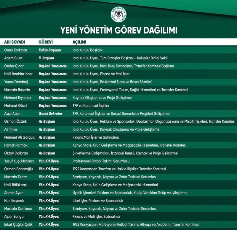 Geçtiğimiz günlerde yapılan olağanüstü genel kurul sonrası Ömer Korkmaz başkanlığında yenilenen yönetiminde görev dağılımı belli oldu