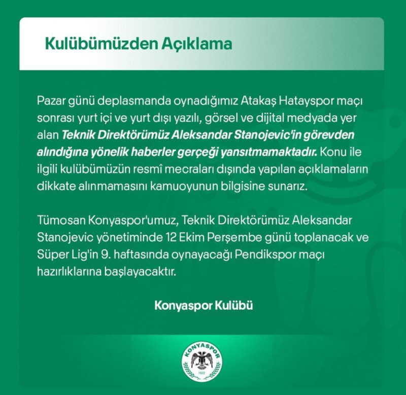 Tümosan Konyaspor Kulübü, teknik direktör Aleksandar Stanojevic'in görevine devam ettiğini açıkladı.