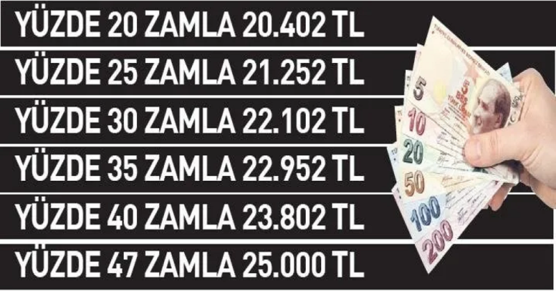 Asgari ücret zammı için bir senaryo konuşuluyor. Merkez Bankası'nın enflasyon hedefi olan yüzde 44'lük artış dikkate alındığında, asgari ücret 24 bin 483 TL'ye çıkacak. Eğer Merkez Bankası'nın 2025 yılı enflasyon tahmini olan yüzde 21 oranında bir zam yapılırsa, asgari ücret 20 bin 572 TL seviyesinde kalacak. Üst bandı temsil eden yüzde 26'lık artış durumunda ise maaş 21 bin 422 TL olarak şekillenecek.