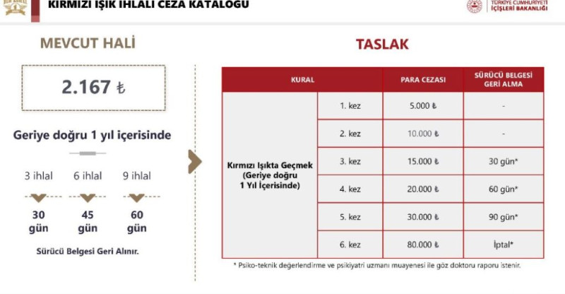 İçişleri Bakanı Ali Yerlikaya, trafikte kırmızı ışık ihlallerine yönelik yeni yaptırımların yolda olduğunu açıkladı. Mevcut uygulamada kırmızı ışıkta geçen sürücülere 2.167 TL ceza kesilirken, yeni düzenleme ile cezaların katlanarak artması bekleniyor.
