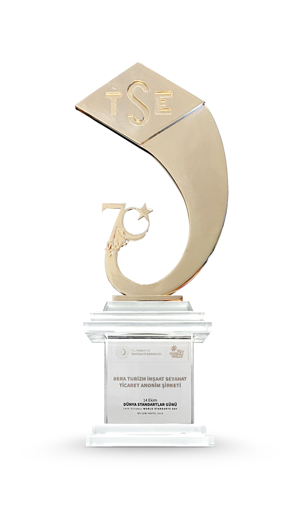 Çeşitli sektörlerde standartlarla ilgili başarılı uygulamalar yapan şirketlerin ödüllendirildiği törende Bera Alanya Otel, helal turizm alanındaki uluslararası standartlara uygun hizmetlerinden dolayı ödüle layık görüldü. 14 Ekim Dünya Standartlar Günü’nde ve TSE’nin 70. Yılında bu ödülü aldıklarına dikkat çeken Bera Alanya Genel Müdürü Ruhat Ülgen Cengiz, ‘Bu önemli an, standartların ve kalitenin ne denli önemli ve değerli olduğunu bir kez daha gözler önüne seriyor. Helal turizm alanındaki katkılarımız bu ödülle taçlanmış oldu, gururluyuz.’ dedi.