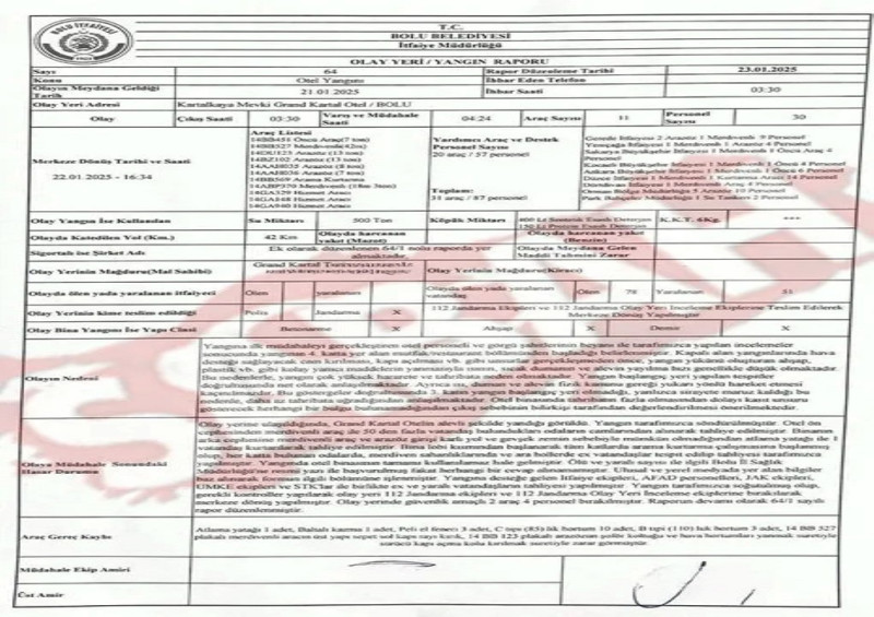 Bolu Kartalkaya’da 78 kişinin hayatını kaybettiği korkunç otel yangınına ilişkin Bolu Belediyesi İtfaiye Müdürlüğü tarafından hazırlanan rapor açıklandı. Rapora göre, yangının çıkış noktasının otelin 4. katındaki restoran ve mutfak kısmı olduğu tespit edildi. Ancak yangının kesin çıkış nedeni için bilirkişi incelemesi gerektiği belirtildi.
