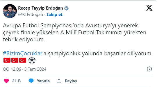 Cumhurbaşkanı Recep Tayyip Erdoğan, Avusturya'yı 2-1 yenerek Avrupa Futbol Şampiyonası'nda çeyrek finale kalan A Milli Futbol Takımı'nı tebrik etti. Başkan Erdoğan "Avrupa Futbol Şampiyonası’nda Avusturya’yı yenerek çeyrek finale yükselen A Millî Futbol Takımımızı yürekten tebrik ediyorum. Bizim Çocuklar’a şampiyonluk yolunda başarılar diliyorum." mesajını paylaştı.