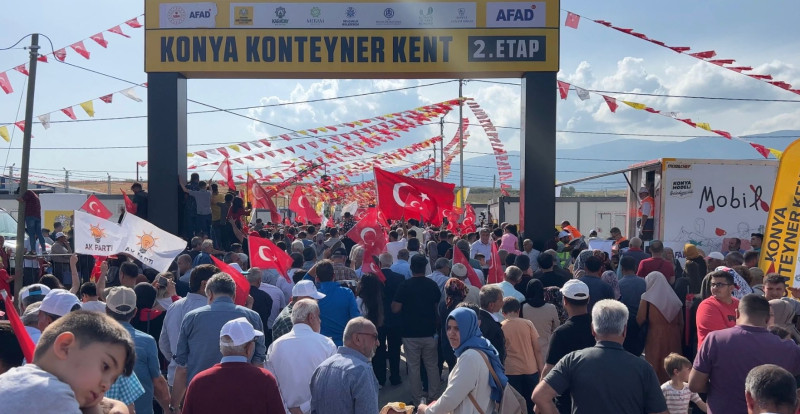 2. Etap Konya Konteyner Kentte depremzedelere önce Sağlık Bakanı Fahrettin Koca, daha sonra da Yeniden Refah Partisi Genel Başkanı Fatih Erbakan ile Milliyetçi Hareket Partisi (MHP) Genel Başkanı Devlet Bahçeli hitap etti.