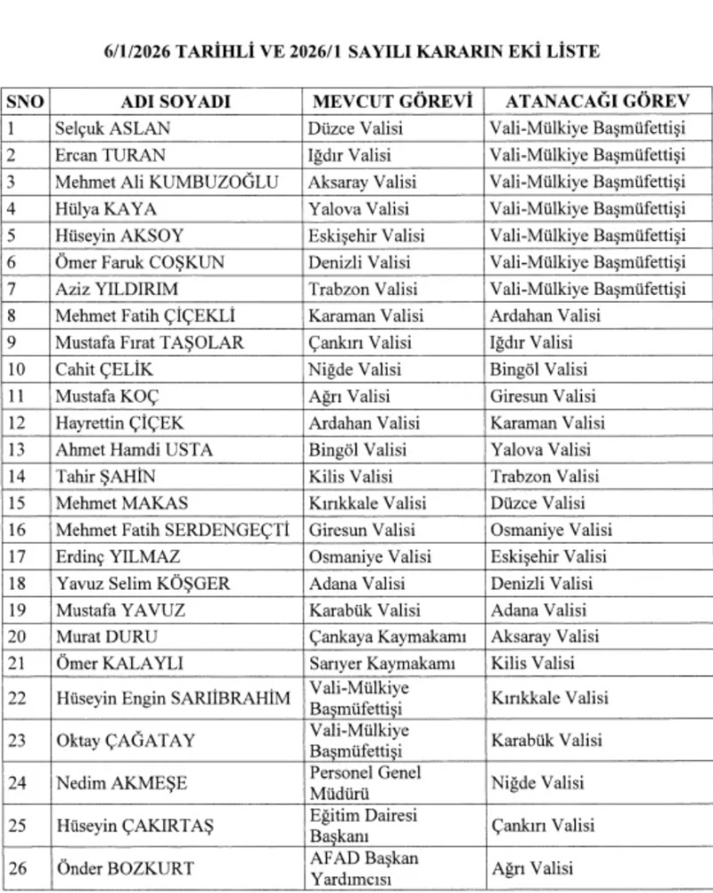 Cumhurbaşkanı Recep Tayyip Erdoğan’ın imzasıyla yayımlanan Valiler Kararnamesi, Resmi Gazete’de yer aldı. Kararname kapsamında 19 ilin valisi değişirken, 7 vali vali–mülkiye başmüfettişliği görevine atanarak merkeze çekildi. Bazı kaymakamlar ve üst düzey bürokratlar ise vali olarak görevlendirildi.