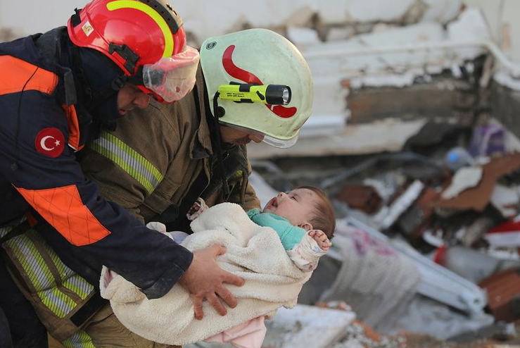 Hatay'da 2 aylık Mehmet Çınar isimli bebek enkazdan sağ olarak çıkarıldı. Onu sağ olarak çıkaran görevli kucağına alıp; "Oy babam, oy babam" diyerek sevip bağrına bastı.