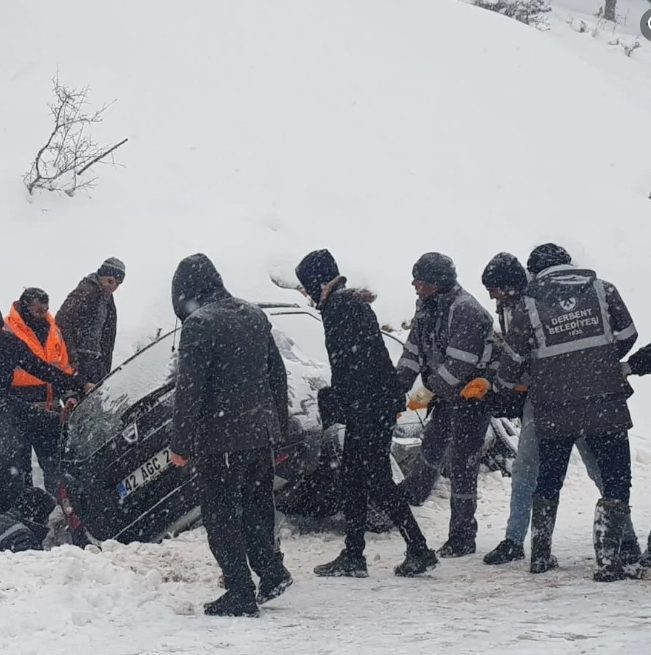 Derbent Aladağ kayak merkezi yolunda ani kar yağışı ve tipi sonucunda araçlar ani fren yapması sonucu kayarak refüje saplandı, araç şoförleri ve yolcular kazayı yara almadan atlattı. Konu ile ilgili bilgi veren Sarıl Arama Kurtarma Başkanı Abdullah Yağcı:’’ Yoğun kar yağışı olacağı günlerdir yetkili kurumlar tarafından açıklanıyor ancak, beyaz bereketi çok özleyen vatandaşlarımız kayak yapmak için Konya’mızın ilk kayak merkezi olan Derbent kayak merkezine gelmişler. Vatandaşlarımız kayaklarını yaptıktan sonra, derbent kayak merkezinden evlerine dönerken araçları ani frenleme yaparak kaydırmışlardır.