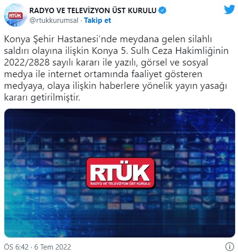 Bu arada, Radyo ve Televizyon Üst Kurulu (RTÜK), olaya ilişkin haberlere yayın yasağı getirdi. Açıklamada, “Konya Şehir Hastanesi’nde meydana gelen silahlı saldırı olayına ilişkin Konya 5. Sulh Ceza Hakimliğinin 2022/2828 sayılı kararı ile yazılı, görsel ve sosyal medya ile internet ortamında faaliyet gösteren medyaya, olaya ilişkin haberlere yönelik yayın yasağı kararı getirilmiştir.” denildi.
