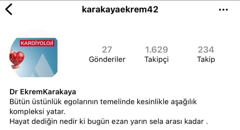 Hayatını kaybeden Dr. Emre Karakaya’nın sosyal medya hesabındaki metin dikkat çekti. Karakaya’nın biyografi bölümüne, “Bütün üstünlük egolarının temelinde kesinlikle aşağılık kompleksi yatar. Hayat dediğin nedir ki bugün ezan yarın sela arası kadar.” yazdığı görüldü.