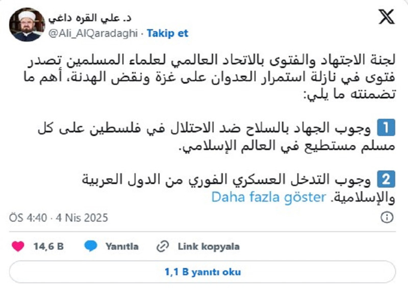 Dünya Müslüman Alimler Birliği Fetva Komitesi tarafından yayımlanan fetva, Gazze halkına yönelik saldırıların devam ettiği bir dönemde gündeme geldi. Birliğin Başkanı Ali Karadaği de konuyla ilgili sosyal medya platformu X üzerinden açıklamalarda bulundu.