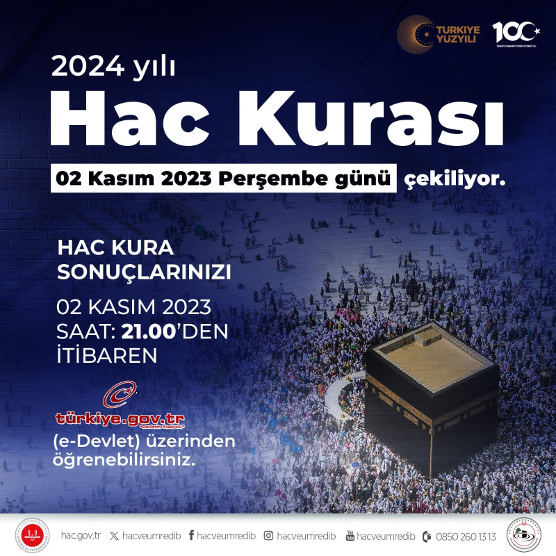 Diyanet İşleri Başkanı Prof. Dr. Ali Erbaş, sosyal medya hesabından paylaştığı mesajda, "Milyonlarca kardeşimizin hasretle beklediği 2024 Hac kurasını 2 Kasım Perşembe günü Diyanet İşleri Başkanlığımızda gerçekleştireceğiz inşallah. Yüce Rabb'imiz bu kutlu yolculuğa duyduğumuz özlemi, sevgiyi, muhabbeti gönlümüzden eksik eylemesin." ifadelerini kullandı.