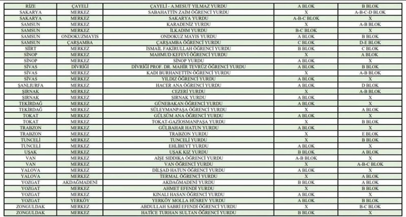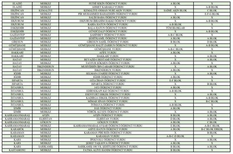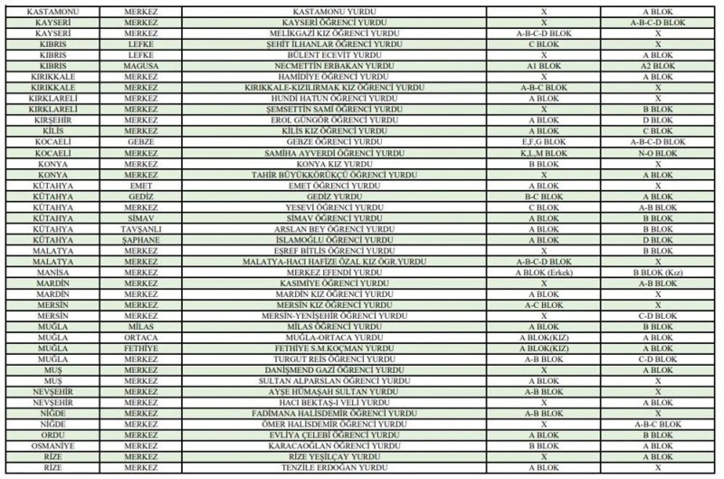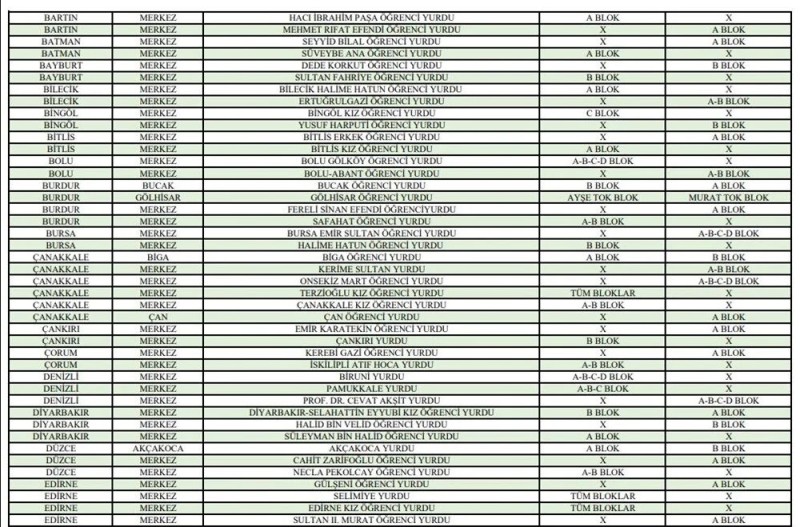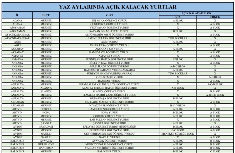 Türkiye genelinde yaz boyunca açık olan KYK yurtları ise şunlar:
