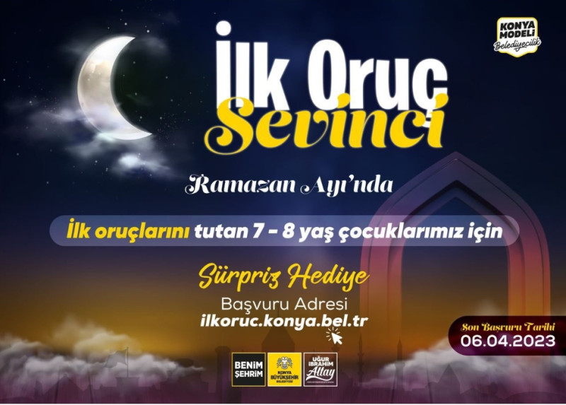 Konya Büyükşehir Belediye Başkanı Uğur İbrahim Altay, "İlk oruç hediyesi için 7-8 yaş çocuklarımızdan bu sene ilk orucunu tutanlar 24 Mart-06 Nisan tarihleri arasında internet üzerinden başvuru yapabilirler. İftar ve sahur sofralarının bereketi tüm çocuklarımızın gözlerinden öpüyorum" ifadelerine yer verdi.
