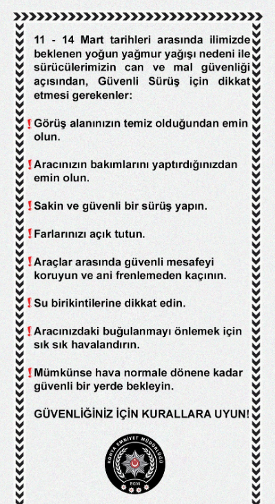 Konya emniyetinden sürücülere şiddetli yağmur uyarısı.Konya emniyeti'' 11-14 Mart tarihleri arasında ilimizde beklenen yoğun yağmur yağışı nedeniyle, sürücülerimizin can ve mal güvenliği açısından ,güvenli sürüş için dikkat etmesi gerekenler: görüş alanınızın temiz olduğundan emin olun, aracınızın bakımlarını yaptığınıza emin olun, sakin ve güvenli bir sürüş yapın farlarınızı açık tutun ,araçlar arasında mesafeyi koruyun ve ani frenlemeden kaçının ,su birikintilerine dikkat edin aracınızdaki, bulunan buğulanmayı önlemek için sık havalandırın, mümkünse hava normale dönene kadar bekleyin.''şeklinde vatandaşlarımızı uyardı