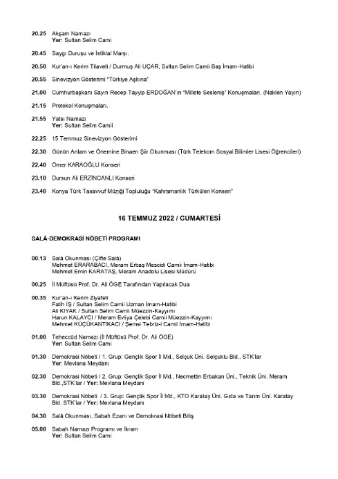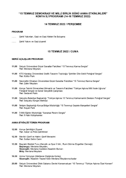Konya'daki 15 Temmuz Demokrasi ve Milli Birlik Günü etkinliklerinin ayrıntılı programı şu şekilde: