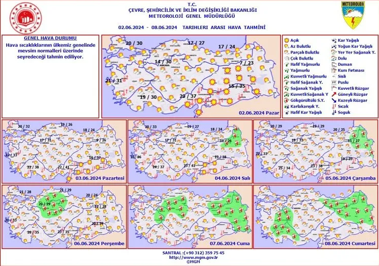 Meteoroloji Genel Müdürlüğü, sosyal medya hesabından haftalık hava durumu tahmin raporunu paylaştı. Raporda 2-8 Haziran tarihlerini kapsayan tahminlere yer verildi.