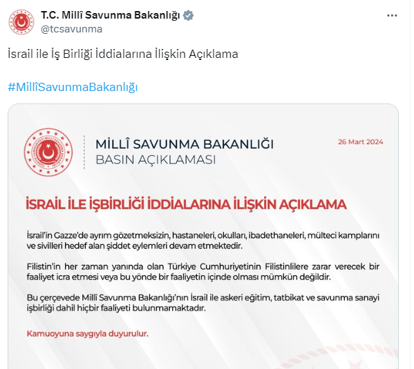 Milli Savunma Bakanlığı'ndan İsrail ile işbirliği iddialarına yönelik sosyal medya hasabından bir yalanlama geldi.
