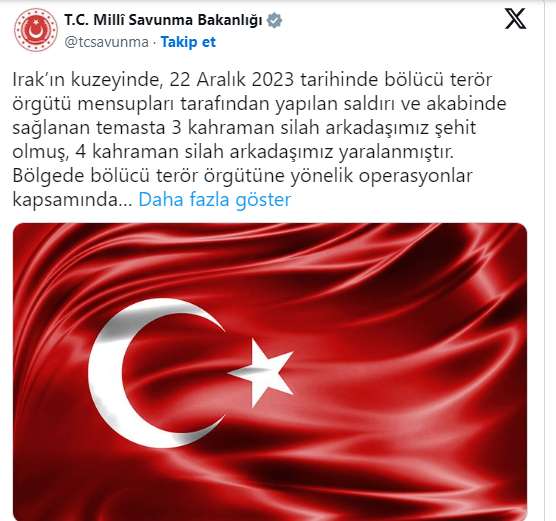 MSB açıklamasında şu ifadeler kullanıldı: Irak'ın Kuzeyi'nde, 22 Aralık 2023 tarihinde bölücü terör örgütü mensupları tarafından yapılan saldırı ve akabinde sağlanan temasta 3 kahraman silah arkadaşımız şehit olmuş, 4 kahraman silah arkadaşımız yaralanmıştır.