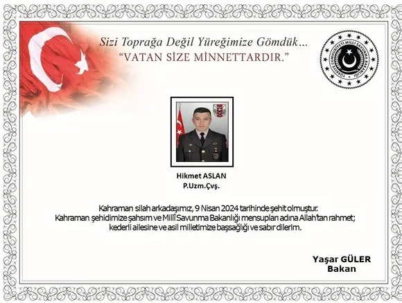 Bakanlıktan yapılan açıklamada, "Pençe-Kilit Operasyonu bölgesinde, 9 Nisan 2024 tarihinde (bugün) teröristlerce yapılan taciz atışı sonucunda yaralanarak hastaneye sevk edilen kahraman silah arkadaşımız Piyade Uzman Çavuş Hikmet Aslan, tedavi gördüğü hastanede yapılan tüm müdahalelere rağmen kurtarılamayarak şehit olmuştur." ifadelerine yer verildi.