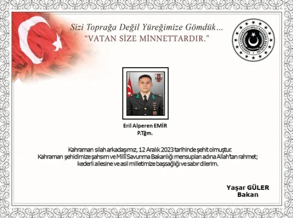 "Pençe-Kilit Operasyonu bölgesinde, bölücü terör örgütü mensupları tarafından yapılan saldırıda kahraman silah arkadaşımız Piyade Teğmen Eril Alperen Emir şehit olmuştur.