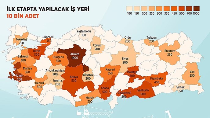 En çok iş yerinin yapılacağı il, 1000 iş yeriyle Ankara olacak. Ankara'yı 700 ile İzmir, 500'er iş yeri ile Bursa, Konya, Adana, Malatya, Gaziantep ve Şanlıurfa izleyecek.