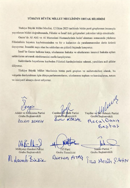 İsrail'in Gazze'deki hastane saldırısı TBMM Genel Kurulu tarafından ortak imzayla kınandı.