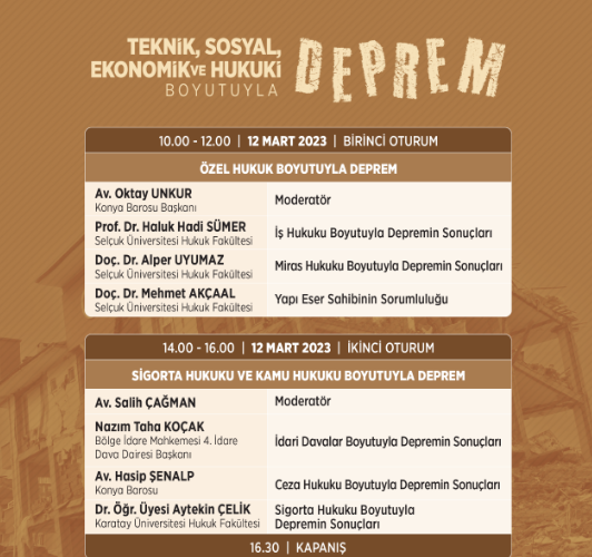 Çalıştayın son oturumu ise “Sigorta Hukuku ve Kamu Hukuku Boyutuyla Deprem” başlığı altında gerçekleştirilecek. Bölge İdare Mahkemesi 4. İdare Dava Dairesi Başkanı Nazım Taha Koçak, KTO Karatay Üniversitesi Hukuk Fakültesi Öğretim Üyesi Dr. Aytekin Çelik ile Konya Barosu’ndan Av. Hasip Şenalp; Avukat Salih Osman Çağman moderatörlüğünde yapılacak oturumda sunumlarını yapacaklar.
