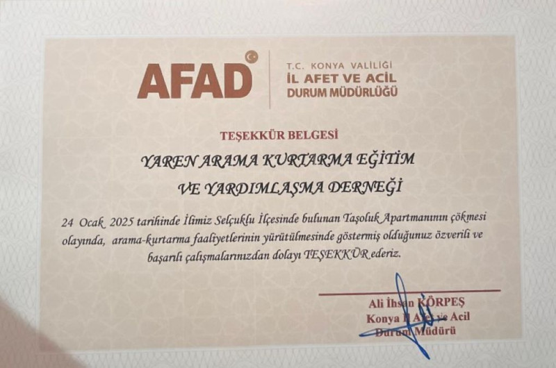 Toplantı kapsamında, olayın değerlendirmesi yapılırken sahada görev alan kuruluşlara Konya Valiliği Afad il müdürlüğü tarafından teşekkür belgeleri takdim edildi. Toplantı ile ilgili bilgi veren Başkan Yardımcısı İNGEÇ Bu anlamlı programda yer almaktan onur duyduk,