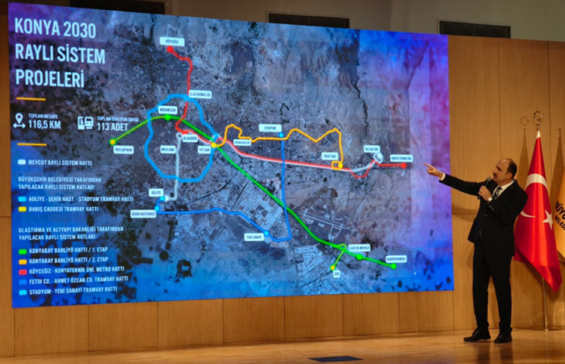 Konya Büyükşehir Belediye Başkanı Uğur İbrahim Altay, “Yeni Raylı Sistemler Bilgilendirme Toplantısı”nda şehir ulaşımına dair dev projeleri kamuoyuyla paylaştı. Barış Caddesi Tramvay Hattı, Şehir Hastanesi–Stadyum Tramvay Hattı’nın birinci ve ikinci etapları ile KONYARAY Banliyö Hattı hakkında bilgi veren Başkan Altay, “Mevcut 26,7 kilometrelik raylı sistemimize ek olarak yapımı süren 58 kilometrelik yeni hatlarımız tamamlandığında, Konya kuzeyden güneye, doğudan batıya raylı sistemlerle donatılmış olacak” dedi.