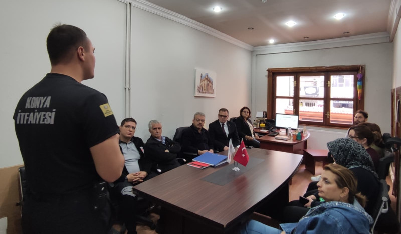 Tatbikat öncesi Bölge Müdürlüğü toplantı salonunda gerçekleştirilen **“Acil Durum ve Yangın Tatbikat Eğitimi”**nde Konya Büyükşehir Belediyesi İtfaiye Dairesi Başkanlığı personeli Eren Oktay, acil durumlar, yangınların çıkış sebepleri ve yangın anında yapılması gerekenler hakkında bilgi verdi.