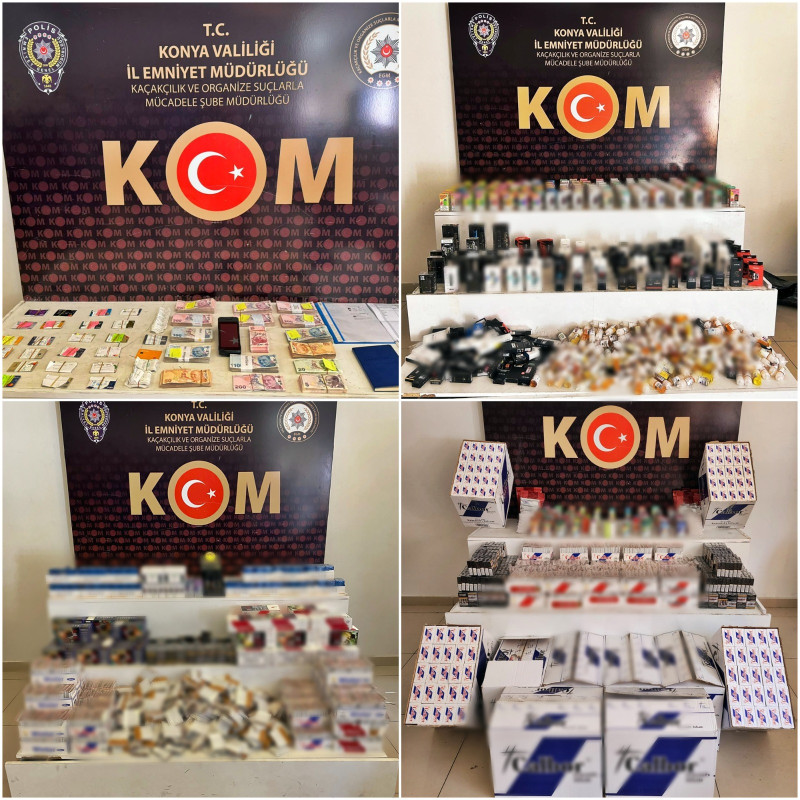 Konya Emniyet Müdürlüğü’ne bağlı Kaçakçılık ve Organize Suçlarla Mücadele Şube Müdürlüğü ekipleri, Konya merkezde bulunan bazı iş yeri, ikamet ve araçlara operasyon düzenledi. Gerçekleştirilen operasyonlarda 7360 paket gümrük kaçağı sigara, 233 bin adet boş makaron, 481 adet elektronik sigara likiti, 31 adet cep telefonu, 242 adet elektronik sigara, 521 adet elektronik sigara yedek parçası, 130 adet TAPDK bandrolü, 100 kilogram tütün, 1 adet sigara dolum makinesi ele geçirildi. 8 şüpheli hakkında adli işlem başlatılırken ele geçirilen ürünlerin piyasa değerinin 1 milyon 850 bin TL olduğu belirlendi.