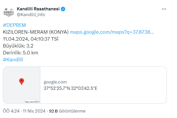 Kandilli Rasathanesi verilerine göre Konya'nın Meram ilçesi Kızılören mahllesinde 3.2 büyüklüğünde bir deprem meydana geldi. Daha öncede o bölgede 5 büyüklüğünde maddi hsarlı deprem meydana gelmişti. mahalle sakinlerini korkutan bu depremde can ve mal kaybı yaşanmadı.