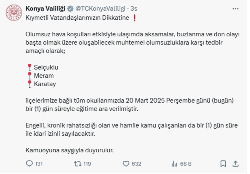 'Sarayönü Altınekin, Hadim, Taşkent, Seydişehir, Bozkır, Güneysınır, Halkapınar, Derbent, Emirgazi, Doğanhisar, Derebucak, Hüyük ilçelerimizde, devam eden yoğun kar yağışı, olumsuz hava koşulları ve buzlanma riski nedeniyle ulaşımda meydana gelebilecek olumsuzluklara karşı önleyici tedbir olarak, İlçe Hıfzıssıhha Kurulu kararı ile 20 Mart 2025 Perşembe günü ilçelerimiz genelindeki tüm ilk ve orta dereceli okullar ile özel eğitim ve rehabilitasyon merkezlerinde eğitim-öğretim gören öğrencilerimiz için eğitim-öğretime (bir) gün süreyle ara verilmesine; Kamu kurumlarında görev yapan hamile, engelli ve kronik hastalığı bulunan personelin (bir) gün süreyle idari izinli sayılmasına,karar verilmiştir' diye açklama yapmıştı.