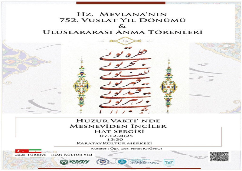 “Anadolu ve İran coğrafyası, kültürün, sanatın ve ilmin yüzyıllardır iç içe geliştiği iki kadim medeniyet havzasıdır. Türkiye–İran Kültür Yılı vesilesiyle bu birlikteliği hat sanatıyla yeniden görünür kılmanın mutluluğunu yaşıyoruz. Hz. Mevlana’nın 752’nci vuslat yıl dönümünde Karatay Belediyesi olarak ‘Mesneviden İnciler Hat Sergisi’ ile bu mirasa katkı sunmak istedik. 7 Aralık’ta gerçekleştireceğimiz sergiye tüm vatandaşlarımızı davet ediyorum.