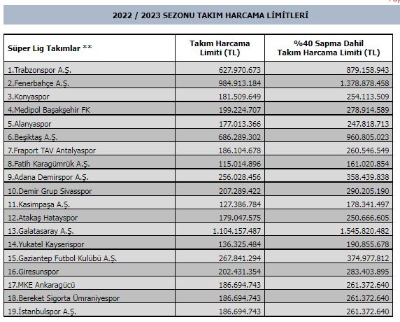 Türkiye Futbol Federasyonundan yapılan açıklamaya göre, geçen sezonu üçüncü sırada tamamlayan Konyaspor’un %40 sapma limiti dahil olarak açıklanan rakamlarda harcama limiti 254 milyon 113 bin olarak belirlenirken, şampiyon olarak tamamlayan Trabzonspor’un harcama limiti, 879 bin TL harcama limitine sahip olacak. Rakamlarda en yüksek seviyeyi Galatasaray Kulübü gördü. Açıklanan limitlere göre sapma limitleri dahil Galatasaray 1.54 milyon TL, Fenerbahçe 1.37 milyon TL, Beşiktaş, 960 bin TL sahip olacak.