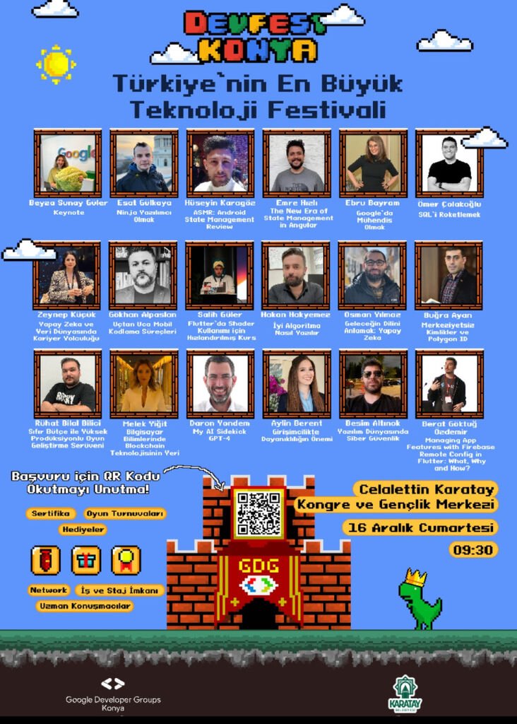 Yenilikçi fikirler, ilham verici konuşmalar ve sektörün öncü isimleriyle dolu bir gün vaat eden teknoloji dünyasının büyük buluşması “DEVFEST Konya 2023”, yine her seviyeden yazılım geliştirici, tasarımcı ve teknoloji meraklısını buluşturacak. Yazılım ve teknoloji dünyasının en yeni trendlerini keşfetmek, sektörün uzmanlarıyla etkileşime geçmek ve onlardan ilham almak isteyen yüzlerce teknoloji tutkunu söz konusu organizasyonla Karatay’da buluşacak.