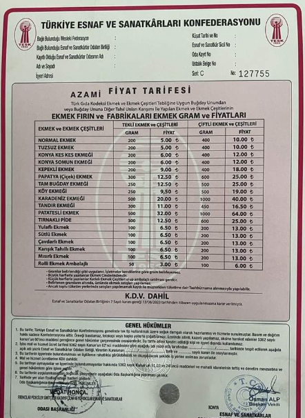 Konya Fırıncılar Odası'nın yeni tarifesine göre Konya'da ekmek yarın itibariyle 5 TL'den satışa sunulacak.