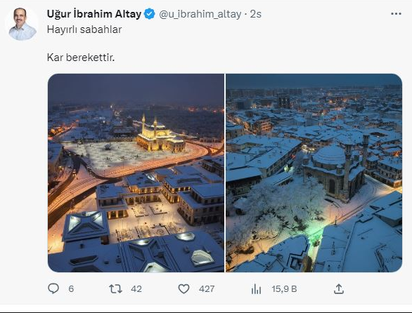 Konya Büyükşehir Belediye Başkanı Uğur İbrahim Altay, sosyal medya hesaplarından "kar berekettir" paylaşımında bulundu. Altay, kar örtüsüyle bürünen Konya'nın fotoğraflarını takipçileriyle paylaştı.