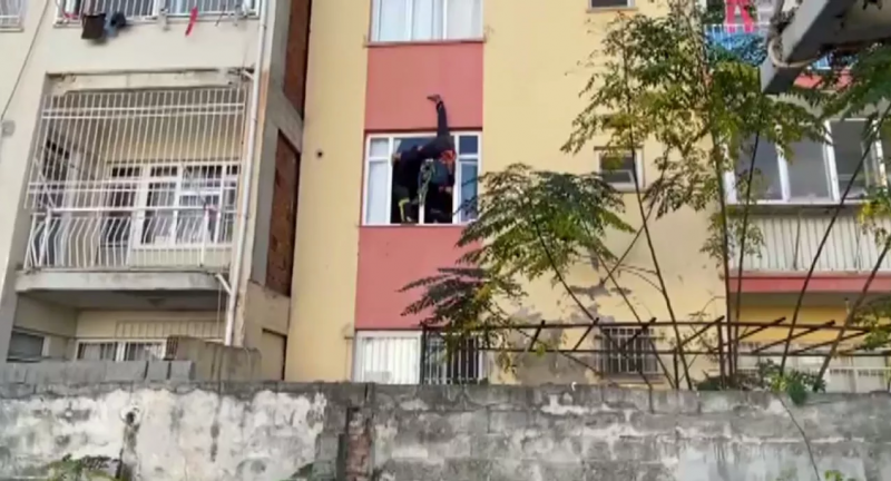 Halatın bir ucunu sabit bir yere, diğer ucunu da bacağına bağlayan İbrahim Çelikdemir, aşağı sarktı. Dairesinin penceresine kadar inen Çelikdemir, tutunarak indiği halat kısa kaldı. Çelikdemir, bir süre sonra yorulup elini bırakınca, bacağından halatta asılı kaldı.