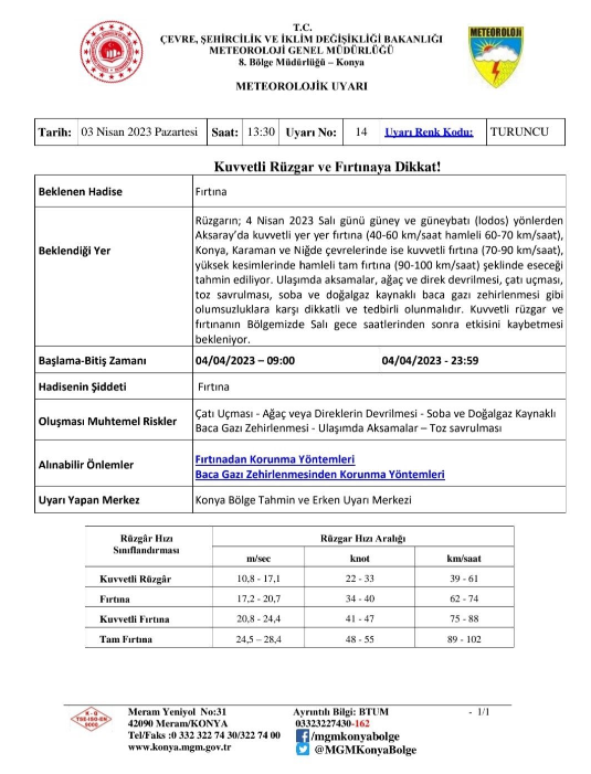 Konya Valiliği Kuvvetli Rüzgar ve Fırtınaya karşı vatandaşların dikkat etmesi gerektiğini duyurdu.Konya Valiliği açıklamasında ayrıca 'Çatı Uçması, Ağaç veya Direklerin Devrilmesi,Soba ve Doğalgaz Kaynaklı Baca Gazı Zehirlenmesi,Ulaşımda Aksamalar gibi oluşması muhtemel risklere karşı vatandaşlarımızın tedbirli ve dikkatli olması önem arz etmektedir' şeklinde uyarıda bulundu.