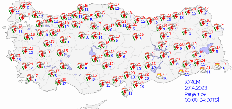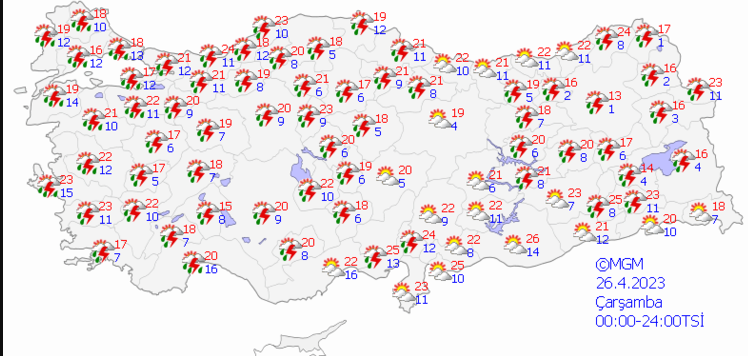 Meteoroloji Genel Müdürlüğü tarafından alınan son verilere göre; yurt genelinin parçalı ve çok bulutlu, Marmara, Ege, Akdeniz'in iç kesimleri, İç Anadolu'nun güney ve batısı, Batı Karadeniz'in iç kesimleri ile Muş, Bitlis, Ağrı ve Van çevrelerinin yerel olmak üzere sağanak ve gök gürültülü sağanak yağışlı geçeceği tahmin ediliyor.